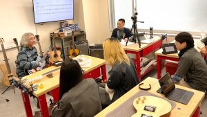 後半は、学生が製作したギター・ベースを深野代表に実際に見ていただき、