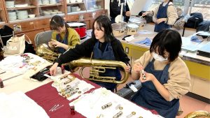 今回の活動は、企業からの委託を受けて行う実践的なインターン。小学校で使用されている備品の管楽器を対象に、メンテナンスや簡易的な修理を行いました。