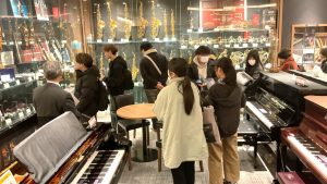 今回の訪問では、ビジネスの授業の一環として、学生たちが実際の店舗運営を見学し、スタッフの方から直接お話を伺うことで、楽器店の工夫や戦略について学びました。
