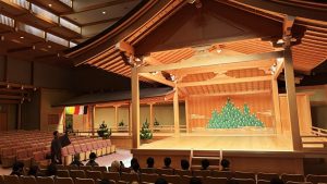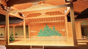 館内には約630席の客席があり、世界最大級の能楽堂としても知られています。舞台奥にある「鏡板(かがみいた)」にも注目です。描かれている松の絵は毎年入れ替えられ、今年は若々しい若松を見ることができました。