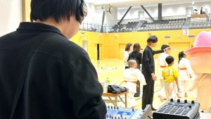 また、会場では空手に挑戦する子どもたちと直接触れ合いながら、安心して楽しめる雰囲気づくりにもチャレンジ。音や演出の力で会場が盛り上がる瞬間を、現場で体感することができました。