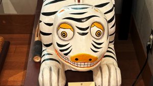 祭礼音楽で使われ、演奏を止める合図として重要な役割を持っています。虎は四神の中で「西」を守る存在とされているため、この楽器も西向きに置かれます。